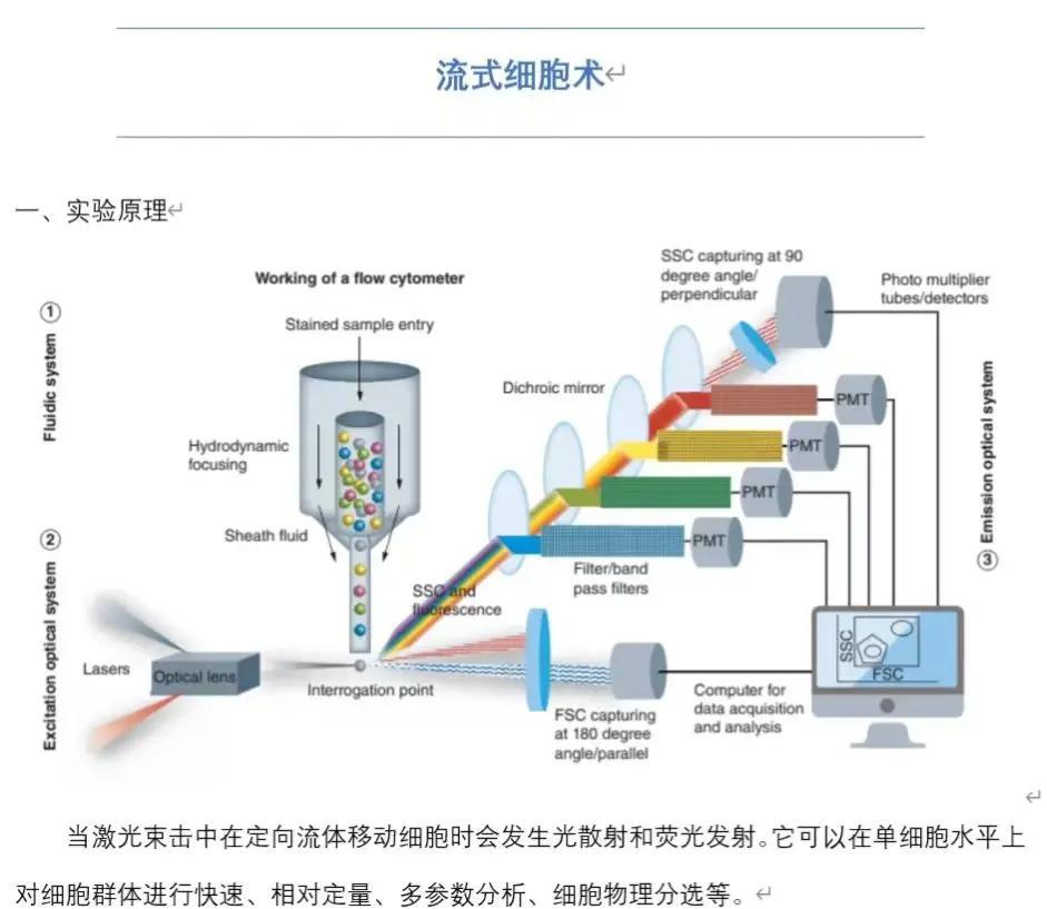 想要做好流式实验,先得摸清它的“工作套路”。流式细胞术的核心原理,是让单个细胞携带荧光信号,在液体流的带动下依次通过激光检测区域,激光照射到细胞上的荧光物质后产生散射光和荧光信号,这些信号被探测器捕捉并转化为数字信号,最终通过软件分析得到细胞的数量、表型等信息。简单来说,就像给细胞“贴标签”(荧光抗体),再让它们“逐个过安检”(激光检测),通过“标签信号”区分不同细胞类型,整个过程精准到单个细胞级别。